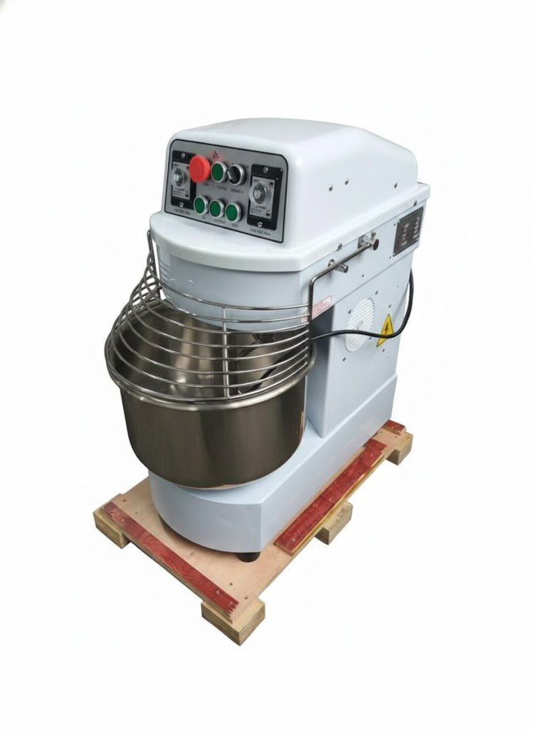 Amasadora de 20 L de dos velocidades, con transmisión por correa y cadena en V para reducir ruido. Las partes que entran en contacto con la masa (Bowl y gancho) están fabricadas en acero inoxidable y cumplen con los estándares nacionales de salubridad.